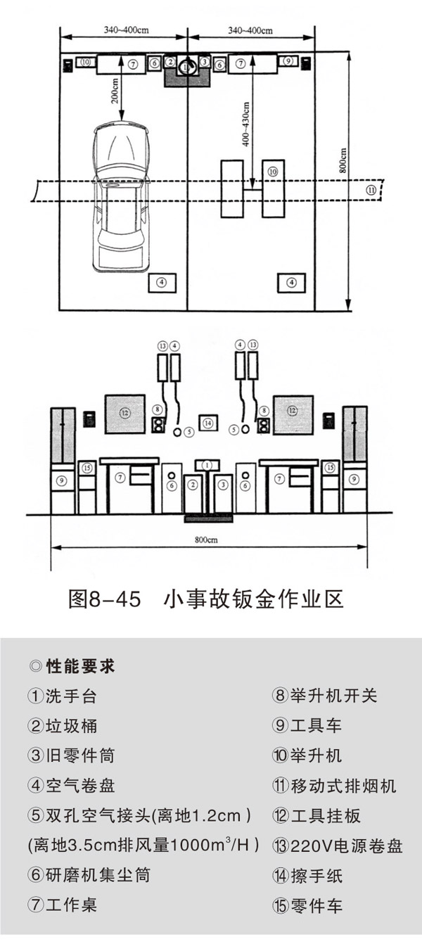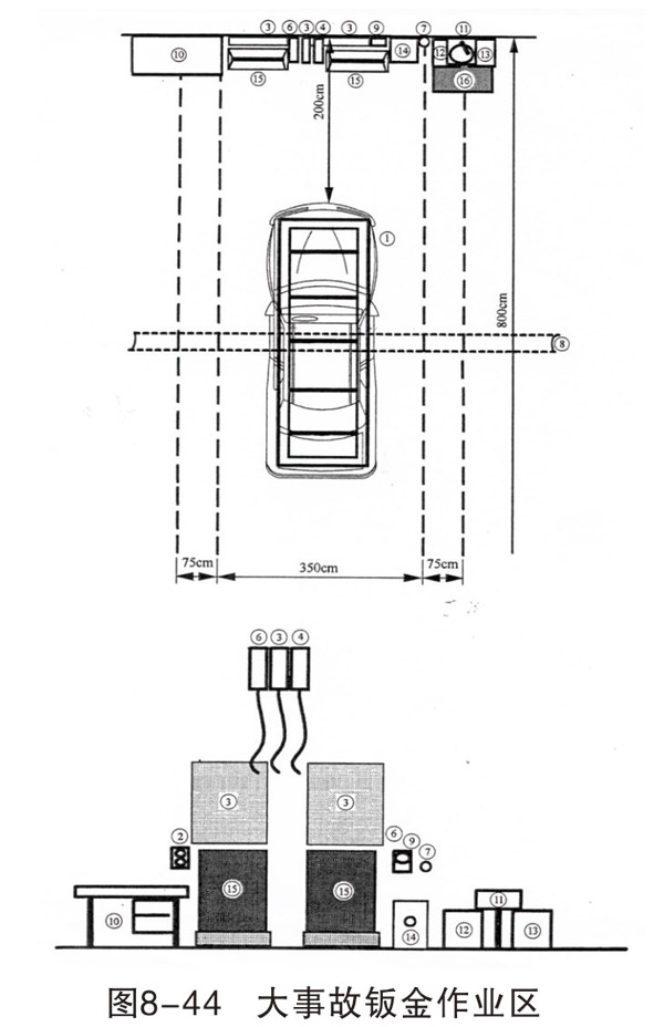 損傷修復(fù)和焊接作業(yè)區(qū)域可各設(shè)置 4~6個(gè)工位,每個(gè)工位的面積約400cm×800cm,每個(gè)工位配相應(yīng)的設(shè)備和操作臺(tái)(架)。車身校正作業(yè)一般設(shè)一個(gè)工位,面積500cm×800cm。如條件允許,可以根據(jù)不同類型的校正架,設(shè)置2~3個(gè)工位。