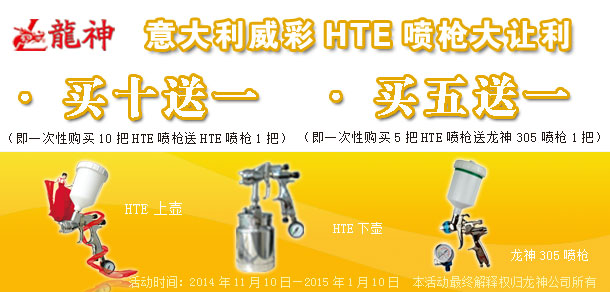 2014年11月吉尼斯HTE噴槍"初冬.讓利"大促銷(xiāo) 2014-11-11 16494 活動(dòng)內(nèi)容: 1、買(mǎi)十送一(即一次購(gòu)買(mǎi)十把HTE噴槍送一把HTE噴槍?zhuān)? 2、買(mǎi)五送一(即一次購(gòu)買(mǎi)五把HTE噴槍送一把龍神305噴槍?zhuān)? 活動(dòng)期間HTE上下壺噴槍的贈(zèng)送方式為:以多贈(zèng)送原則(如:買(mǎi)6把上壺+4把下壺,贈(zèng)送上壺。反之亦然,以此類(lèi)推。)