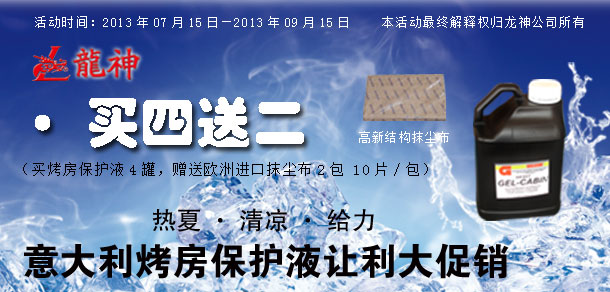 "熱夏 清涼 給力" 意大利烤房保護(hù)液讓利大促銷(xiāo)! 2013-07-16 25171 "熱夏 清涼 給力" 意大利烤房保護(hù)液讓利大促銷(xiāo)!活動(dòng)時(shí)間:2013年07月15日至2013年09月15日。 時(shí)長(zhǎng):共計(jì)2個(gè)月