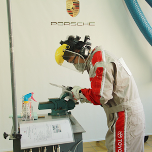 對(duì)鋁板的修復(fù),為了防止在校正中因敲擊過(guò)重而導(dǎo)致鋁板過(guò)度拉伸,一般應(yīng)使用膠錘、木錘,不能使用常規(guī)的鋼板整形工具。用鐵錘和墊鐵校正鋁板時(shí),應(yīng)注意以下兩點(diǎn):
