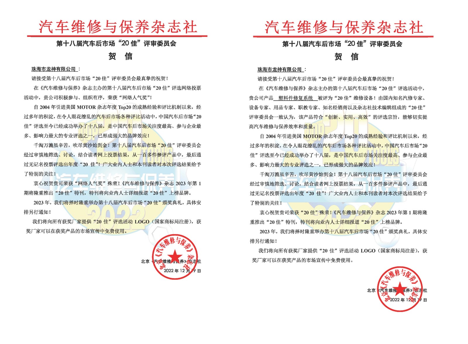 2023年2月16日,由《汽車(chē)維修與保養(yǎng)》雜志主辦的第十八屆汽車(chē)后市場(chǎng)“20佳”維修工具頒獎(jiǎng)盛典在深圳舉行,在維修設(shè)備與網(wǎng)絡(luò)人氣評(píng)比活動(dòng)中,龍神明星產(chǎn)品“塑料件修復(fù)系統(tǒng)”榮獲2022年度“20佳”維修設(shè)備和龍神公司榮獲2022年度“20佳”網(wǎng)絡(luò)人氣獎(jiǎng)殊榮。